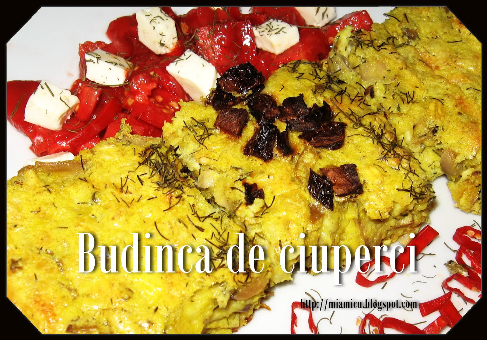 Budinca se poate orna dupa preferinta, pe aceasta am presarat putin marar si cateva rosii uscate.