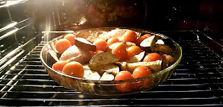 Pesmetul, fulgii de ovaz, faina si praful de copt se amesteca bine si se pun peste legume. Omogenizam amestecul, apoi adaugam sare, condimentele si verdeata.
